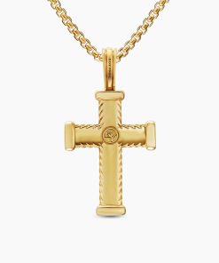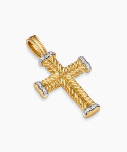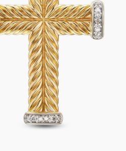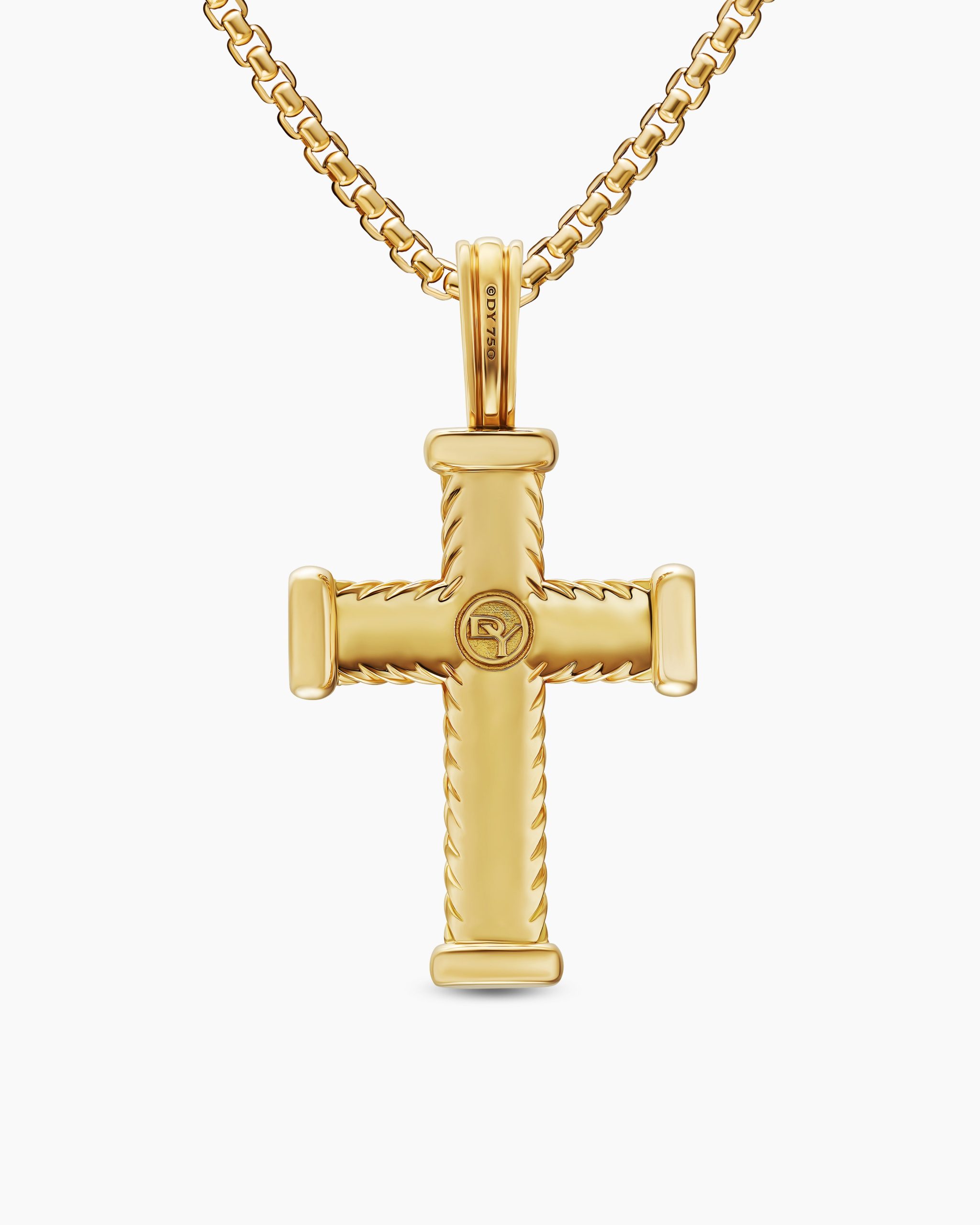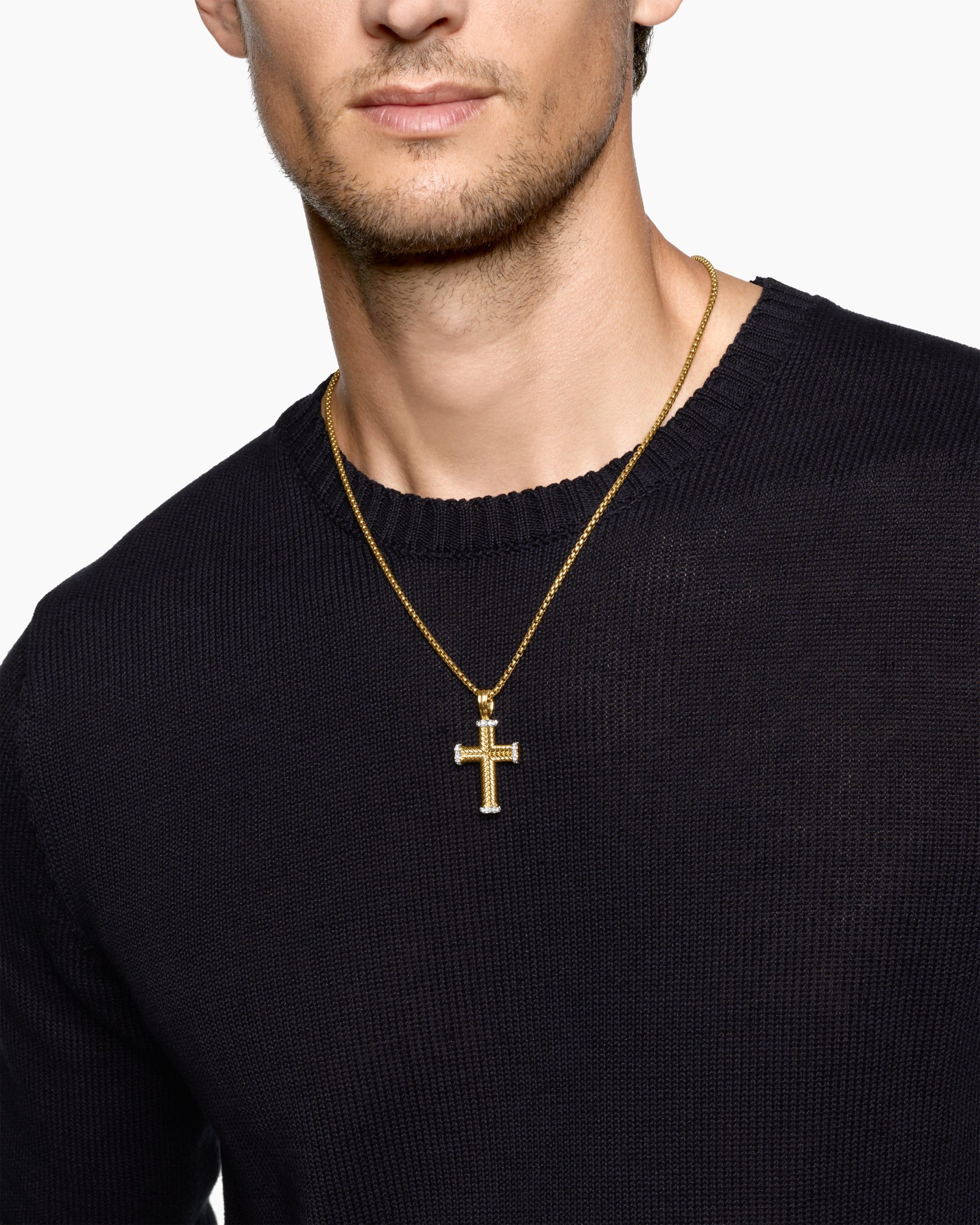 Marked by its double-helix pattern, Chevron is a mirror image of Cable, the house’s signature motif. The ancient V-shaped design offers a sense of modern sophistication, expertly crafted in refined materials, with deep cuts, precise angles, and a play of light and dark to evoke a feeling of forward momentum in the pursuit of excellence. Its elevated look fuses luxury and practicality for everyday wear, imbuing an essence of timelessness and versatility.Cross only; chain not included. To complete the look, add a box chain.18-karat yellow goldPavé-set diamonds, 0.16 total carat weightCross, 33 x 24mmTotal length, 44mmThis item can be engraved. Please contact customer care for more information.