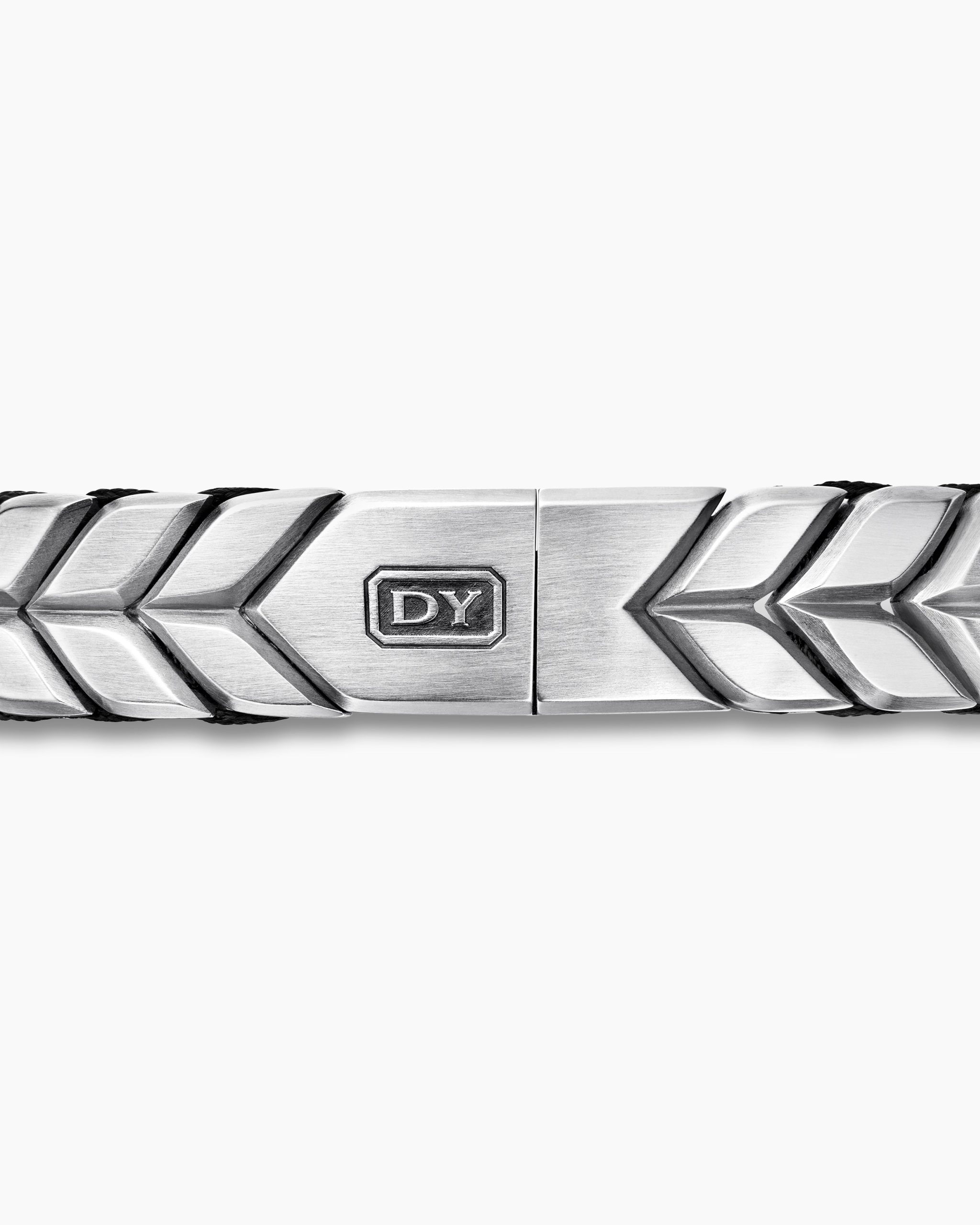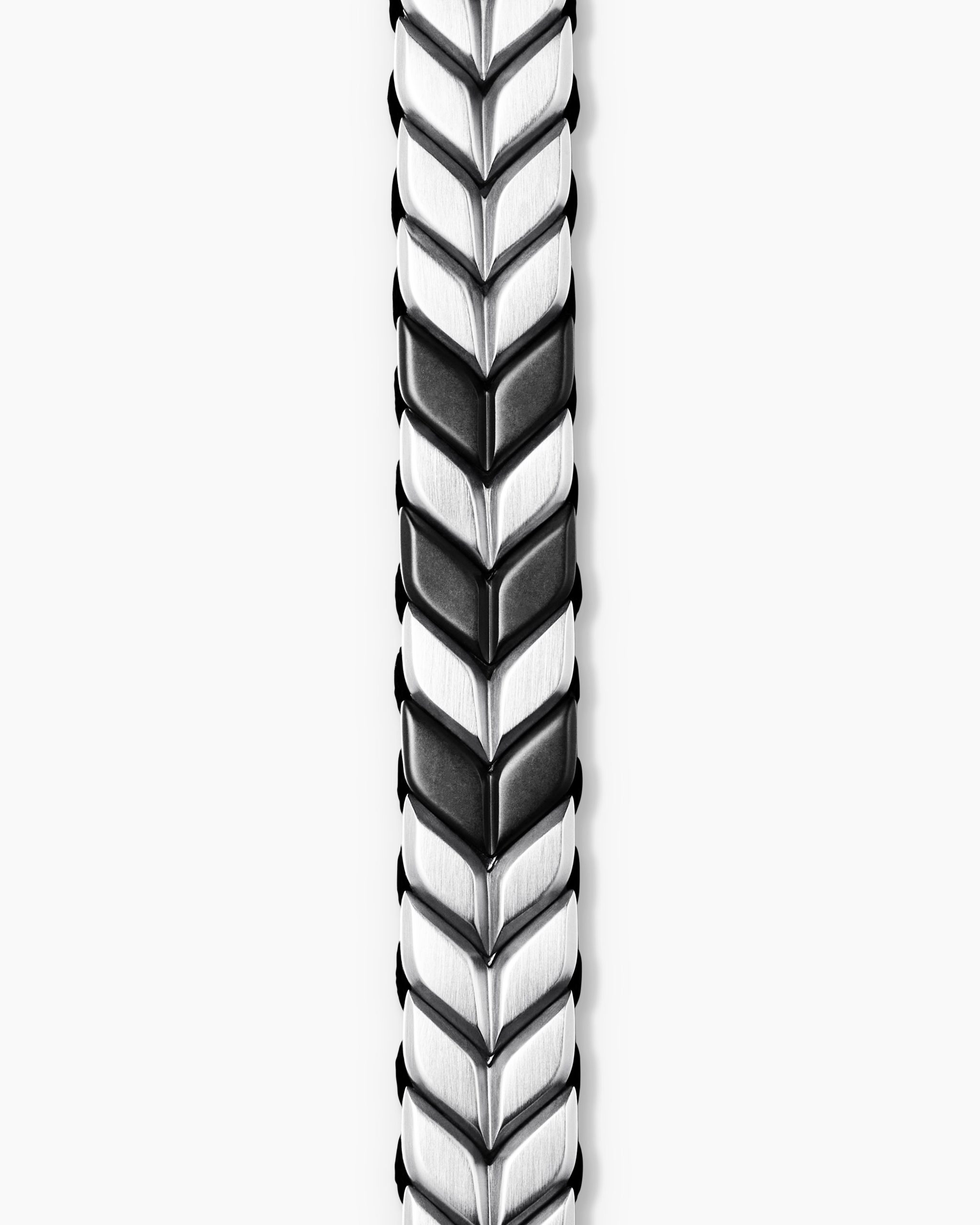 Marked by its double-helix pattern, Chevron is a mirror image of Cable, the house’s signature motif. The ancient V-shaped design offers a sense of modern sophistication, expertly crafted in refined materials, with deep cuts, precise angles, and a play of light and dark to evoke a feeling of forward momentum in the pursuit of excellence. Its elevated look fuses luxury and practicality for everyday wear, imbuing an essence of timelessness and versatility.Black titanium with sterling silverBlack nylonBracelet, 12mmMagnetic clasp