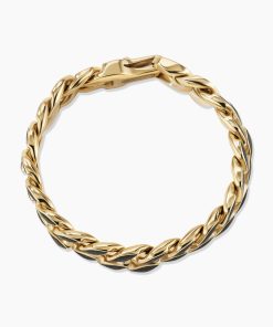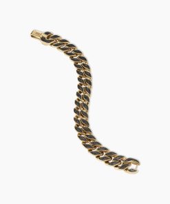Inspired by David’s passion for horses, Curb Chain is the most elevated expression of our signature chain links. Its timeless elegance is rooted in the traditional equestrian bridle tack used to create control and stability during moments of speed. Forged precious metal is carved into Cable-like S-curves, each link crafted with impactful precision and hand-assembled with the next, culminating in a striking chain engineered for effortless movement.18-karat bonded yellow goldForged carbonBracelet, 14.5mmPush clasp