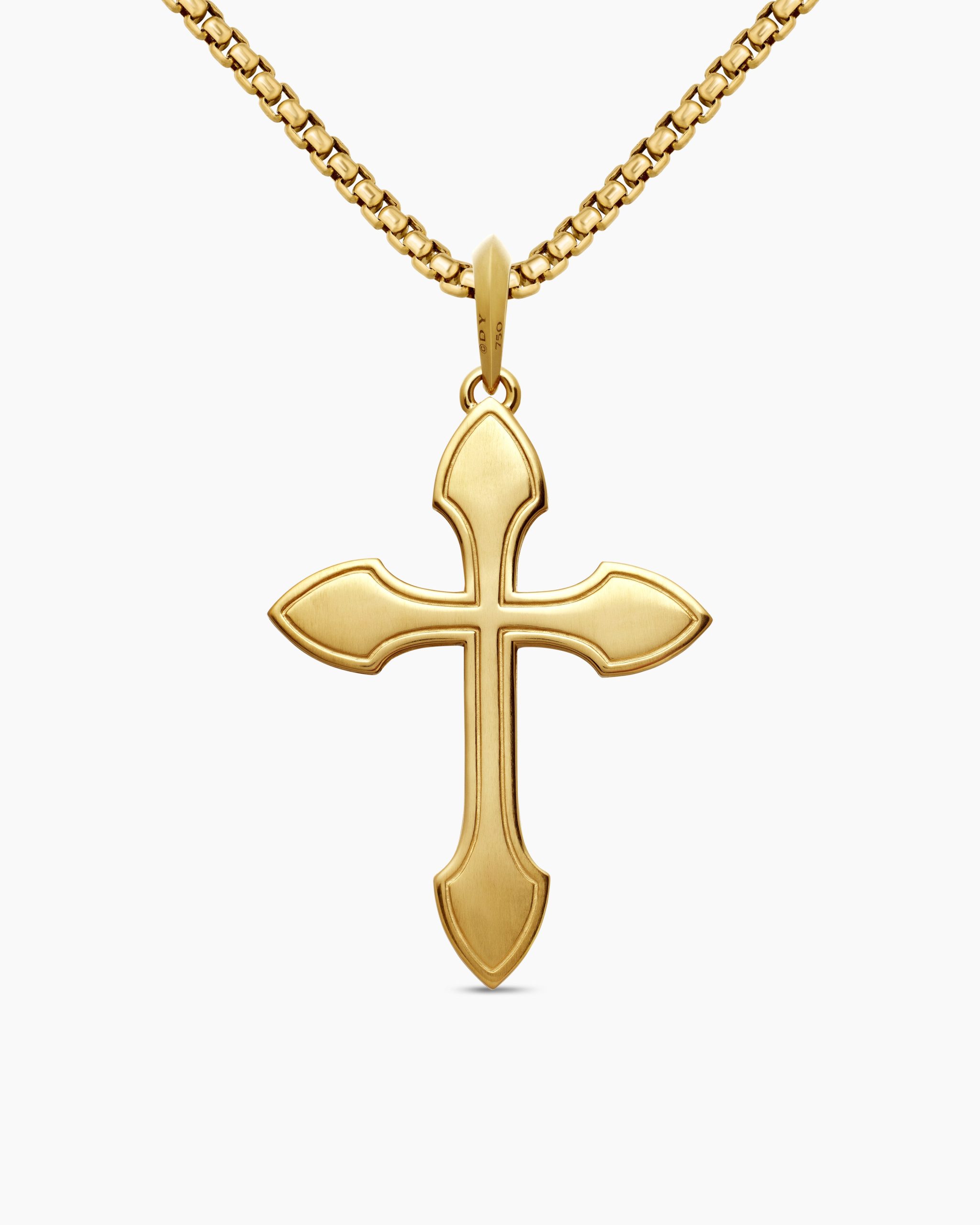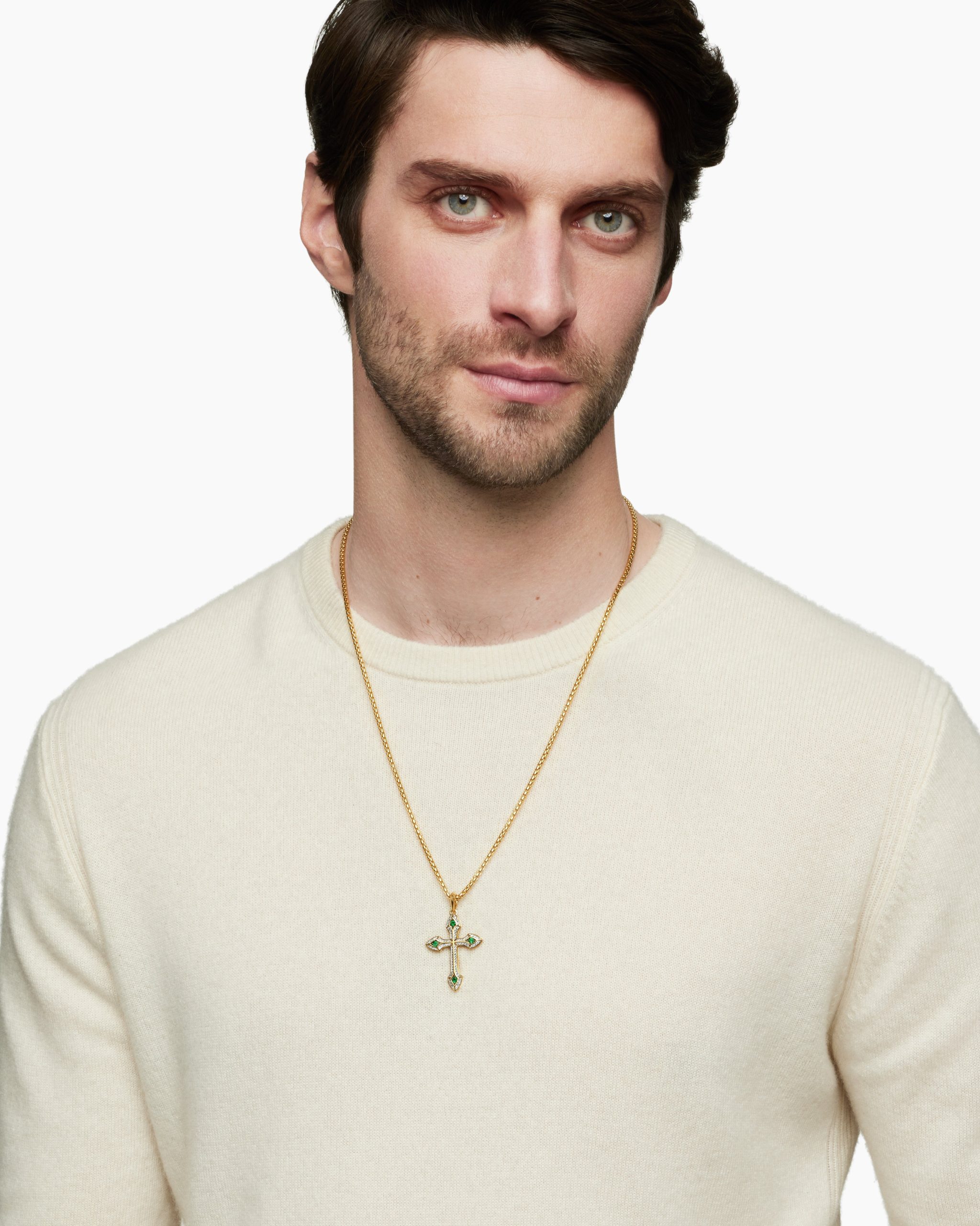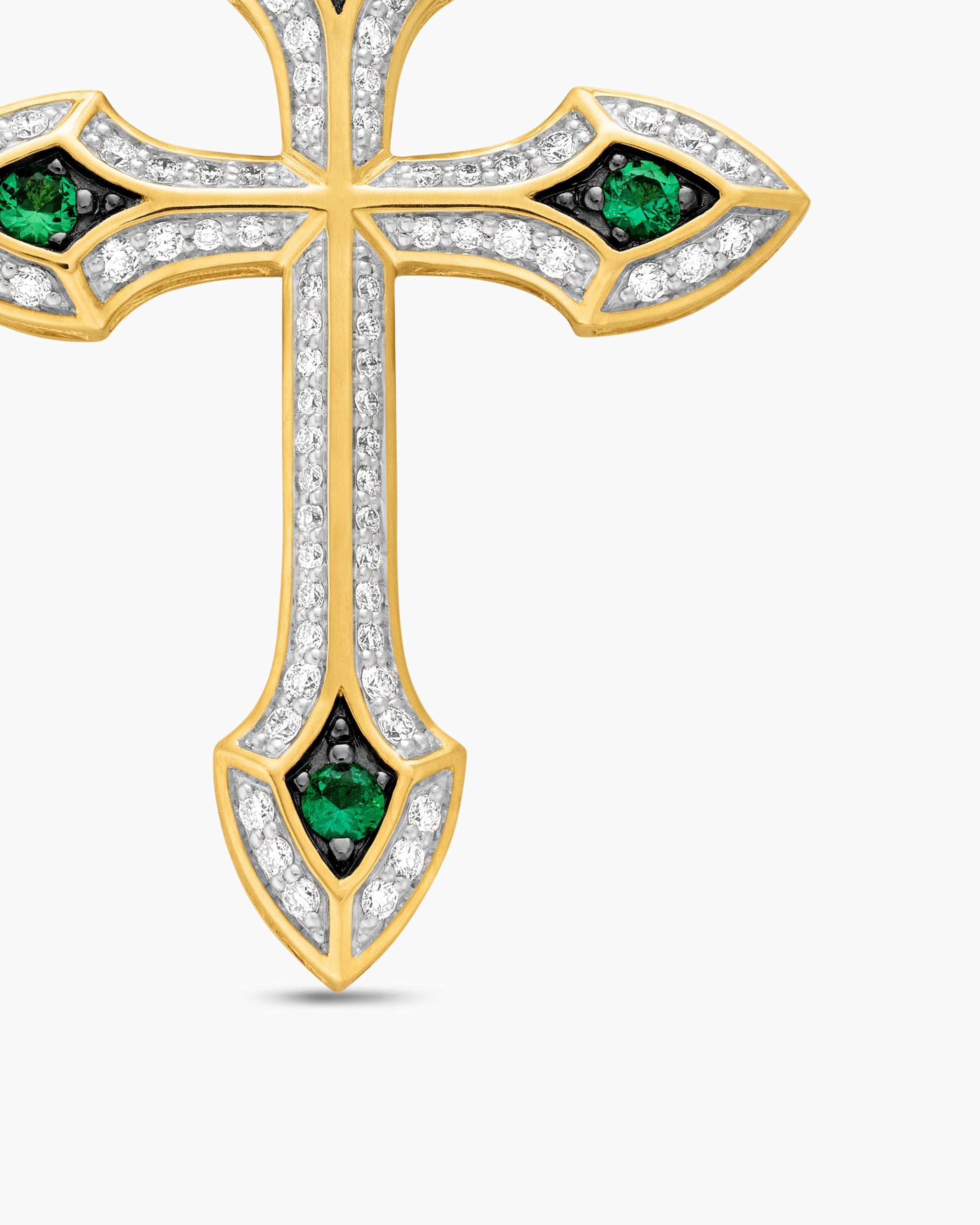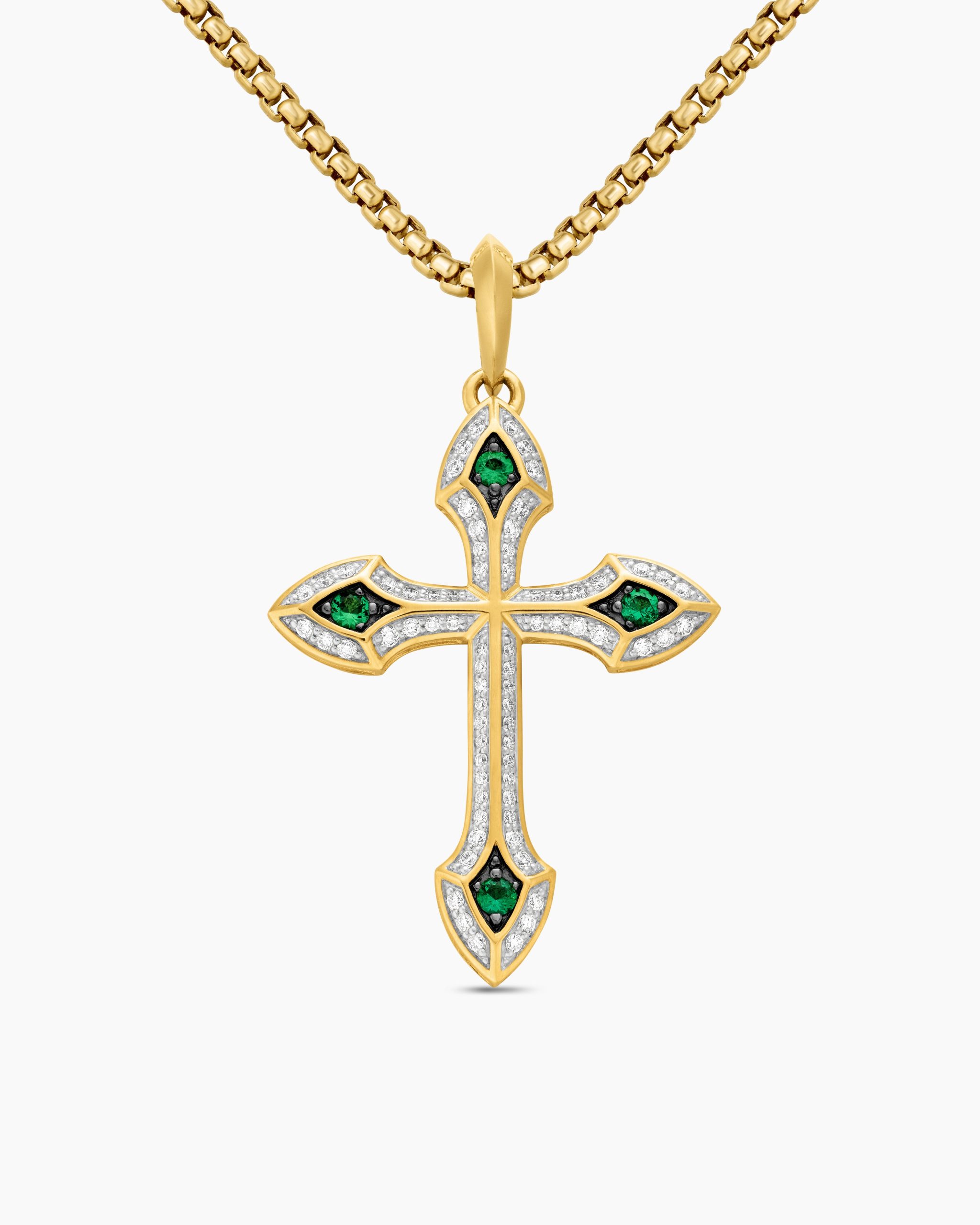 Once linked to spirituality and magic, today’s amulets are expressions of personal style. This collection reflects the modern man’s distinct identities with religious symbols, ancient charms and utilitarian motifs crafted from precious metals and gemstones. 18-karat yellow goldEmeralds, 0.18 total carat weightPavé diamonds, 0.40 total carat weightCross, 36.5 x 27.5mmPlease note: cross only; chain sold separatelyShown with: Box ChainThis item can be engraved. Please contact customer care for more information.