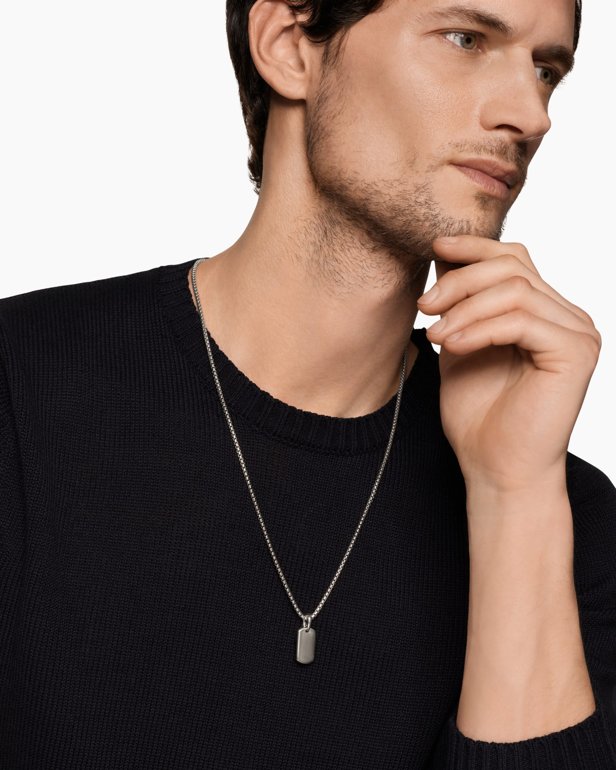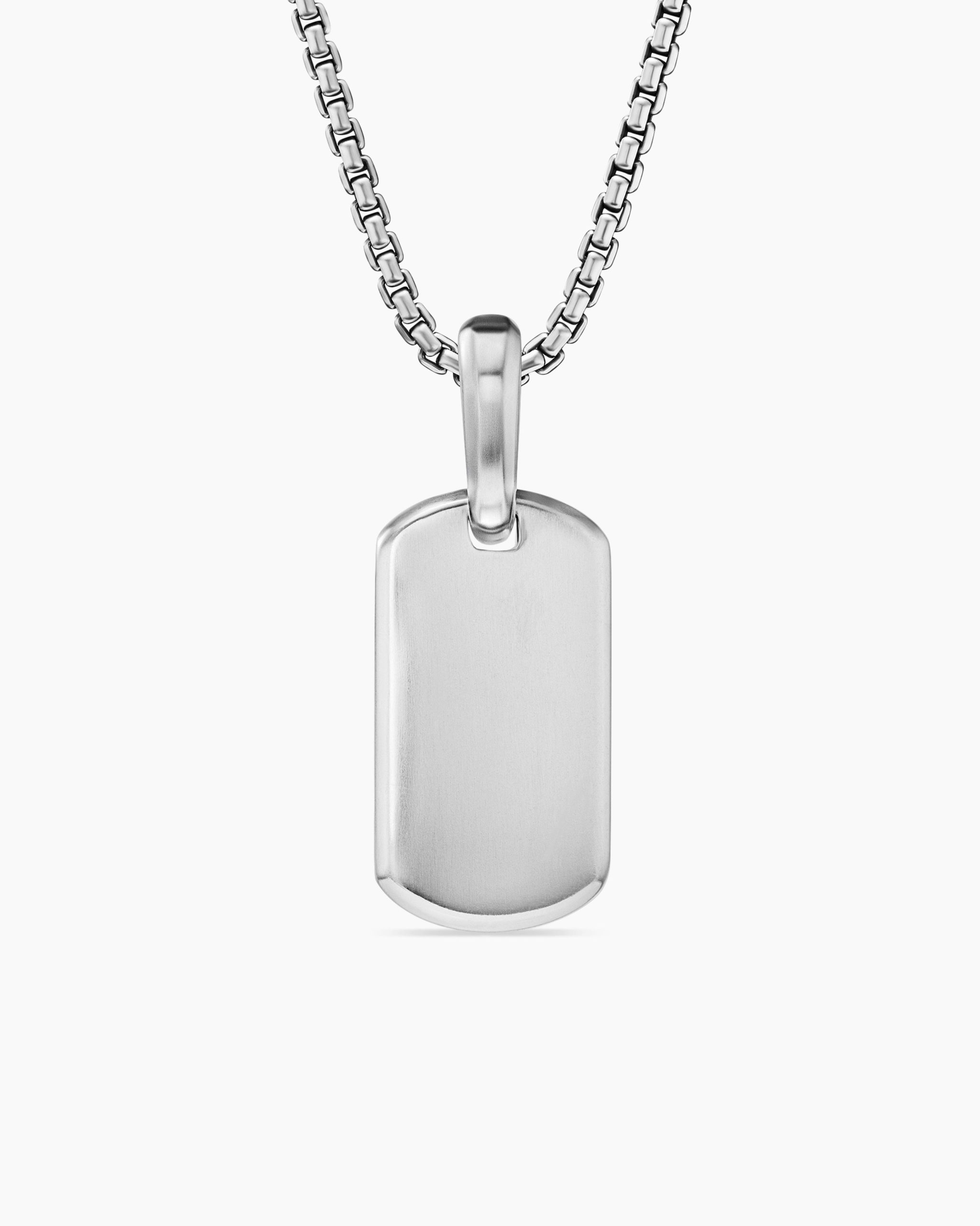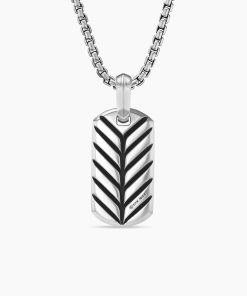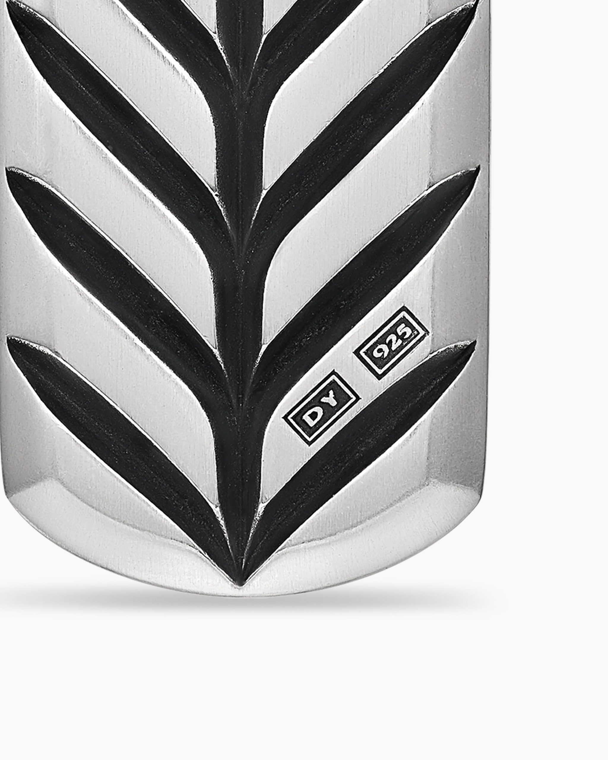 David Yurman skillfully reinterprets chevron—the ancient V-shaped pattern used in architecture and art—in this modern, sculptural collection. Viewed in relation to one another, each half of the motif is a mirror image of Cable. Sterling silverTag, 21 x 11.1mmPlease note: tag only; chain sold separately