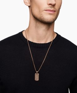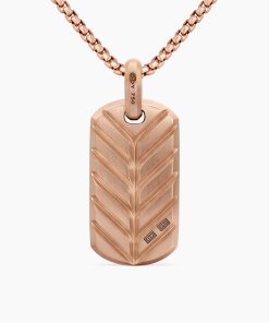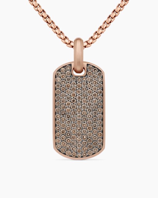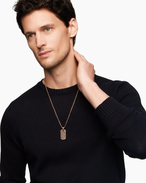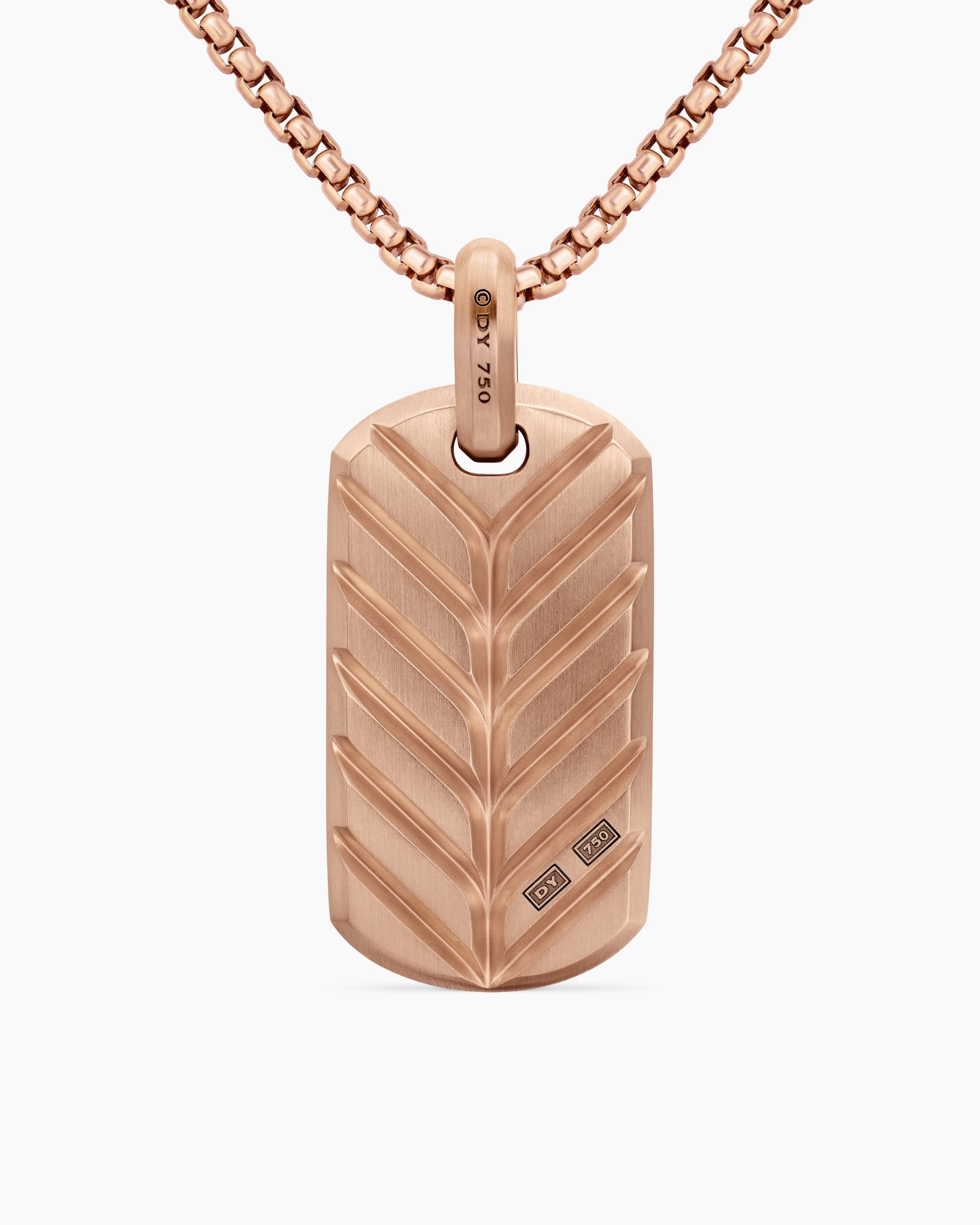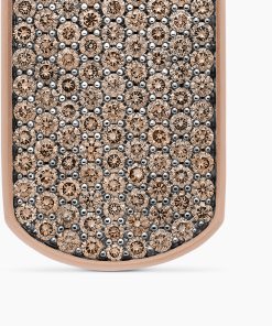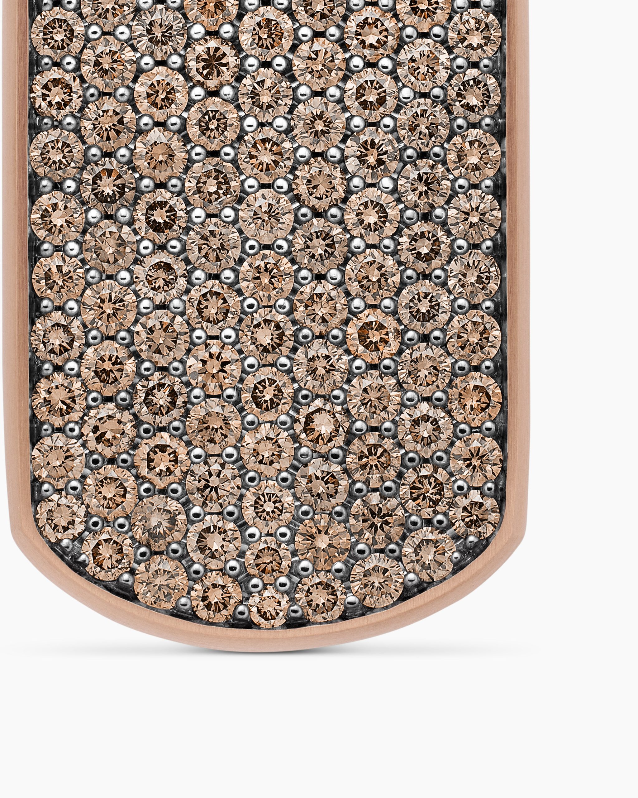 David Yurman skillfully reinterprets chevron—the ancient V-shaped pattern used in architecture and art—in this modern, sculptural collection. Viewed in relation to one another, each half of the motif is a mirror image of Cable. 18-karat rose goldPavé cognac diamonds, 3.47 total carat weightTag, 35 x 18.5mmPlease note: tag only; chain sold separatelyShown with: Box Chain