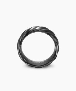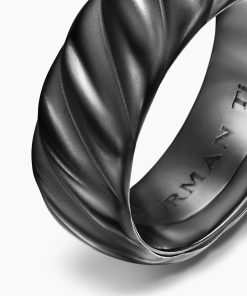 Inspired by his love of architecture and bas-relief sculpture, Evan Yurman designed this modern form by deconstructing Cable—the house’s signature motif—to its essence. Each timeless design is a wearable work of art. Precious metals are meticulously carved with mesmerizing wavelike patterns that dramatically catch the light. Elegant curves highlight the sensuality of the body.Black titaniumRing, 9mm