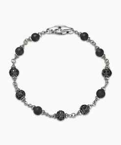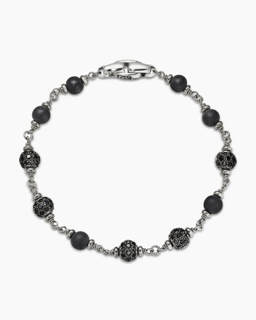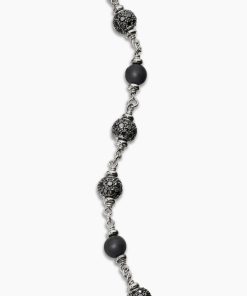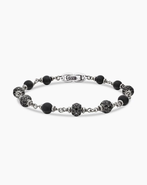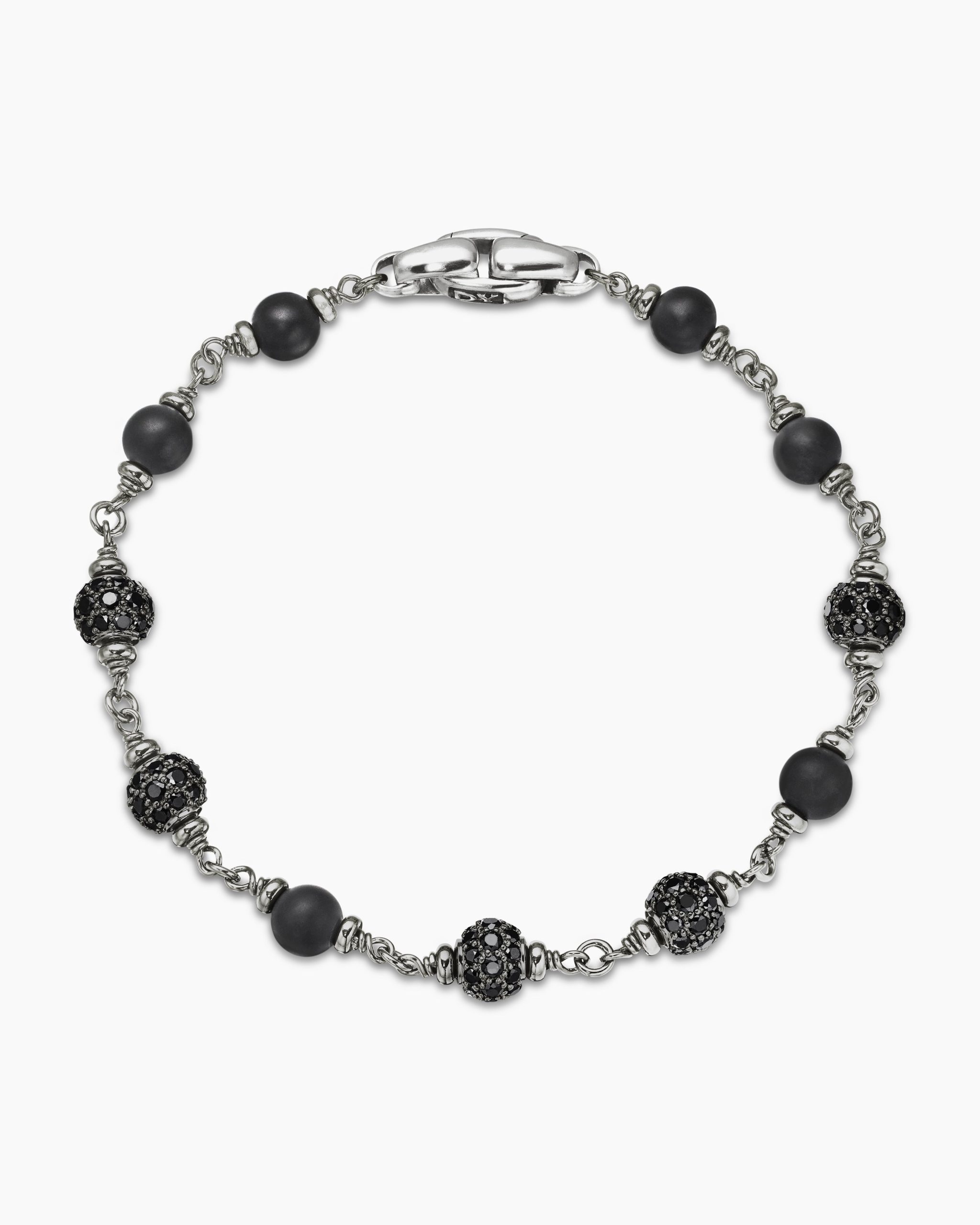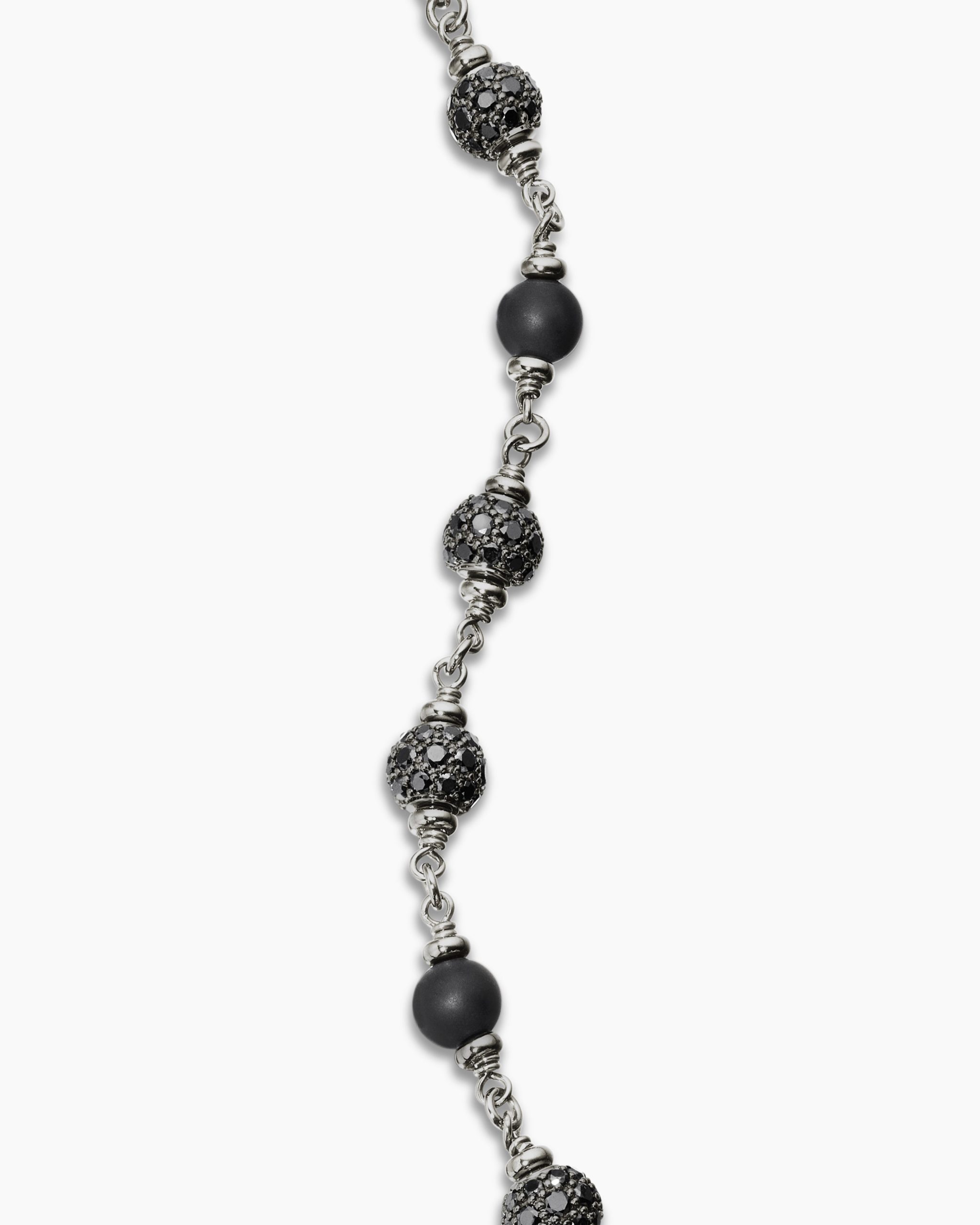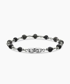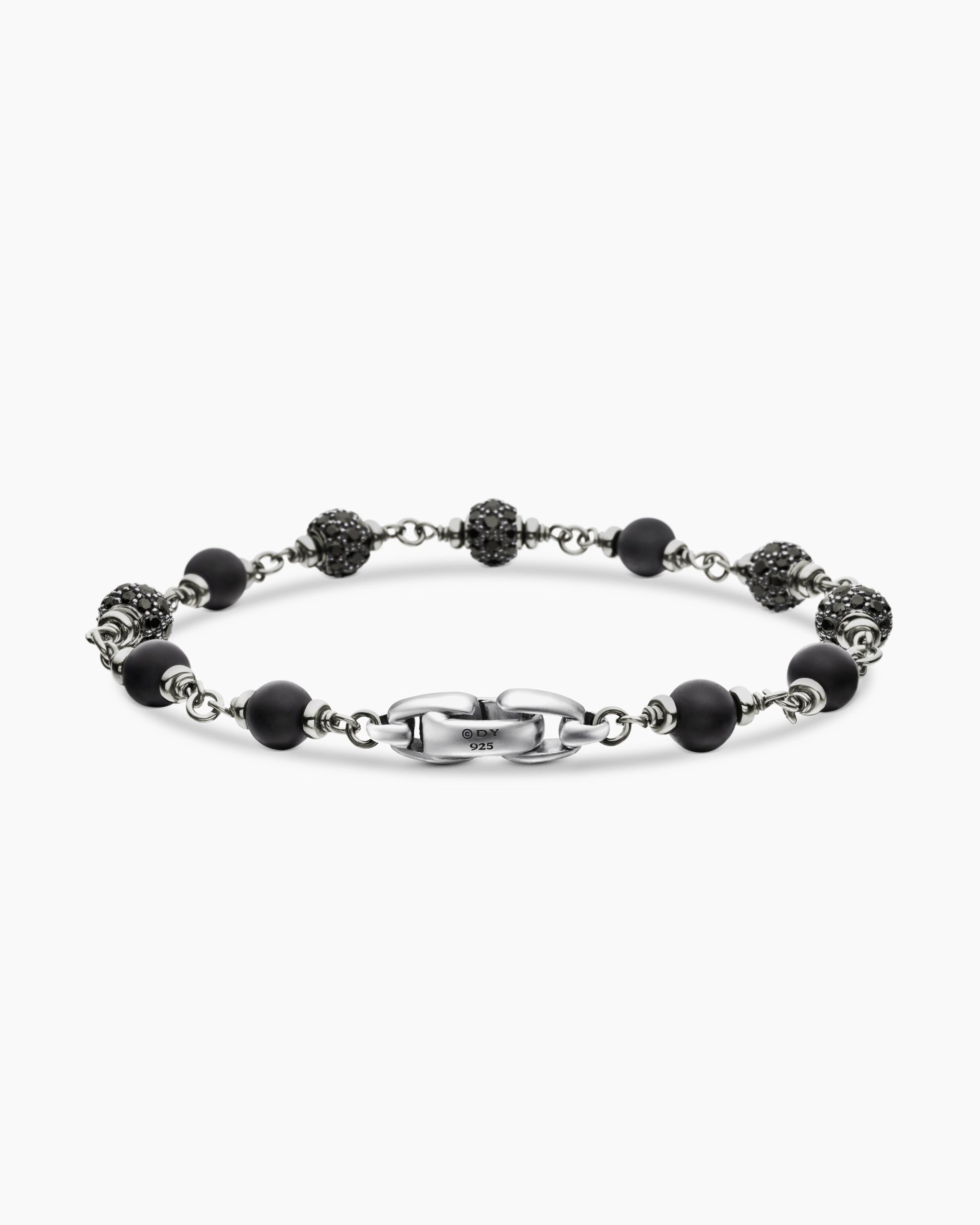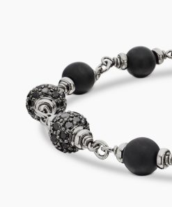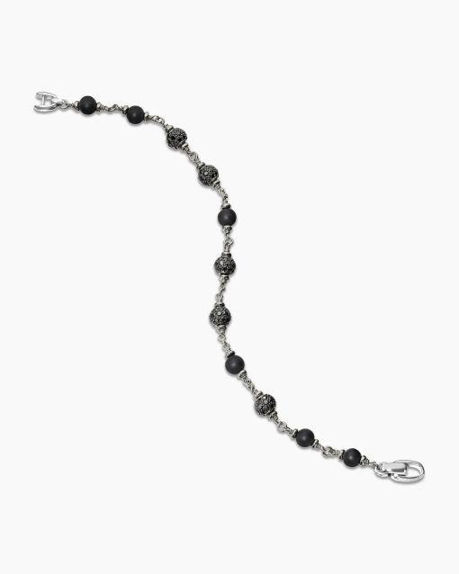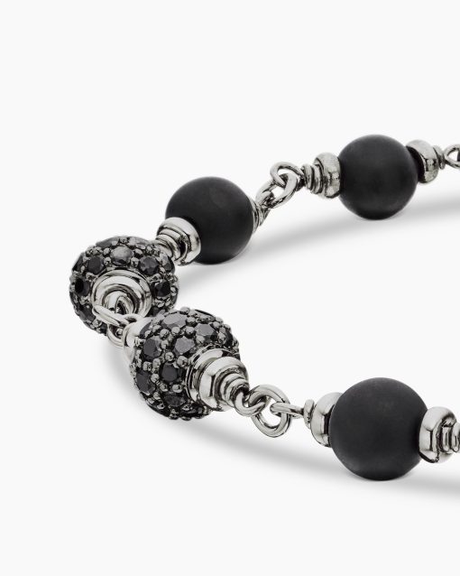 Rooted in spiritual significance, these modern beaded jewelry designs are symbolic of your inner spirit and authenticity. They are meant to be collected, layered, and worn continuously as you move through life’s journey. Expertly crafted, they feature a variety of smoothly polished, semi-precious, and rare gemstones, such as quartz, black onyx and tiger’s eye.Sterling silverBlack onyxPavé-set black diamonds, 2.97 total carat weightBracelet, 6mmPush claspSize large fits wrists up to 8.25in