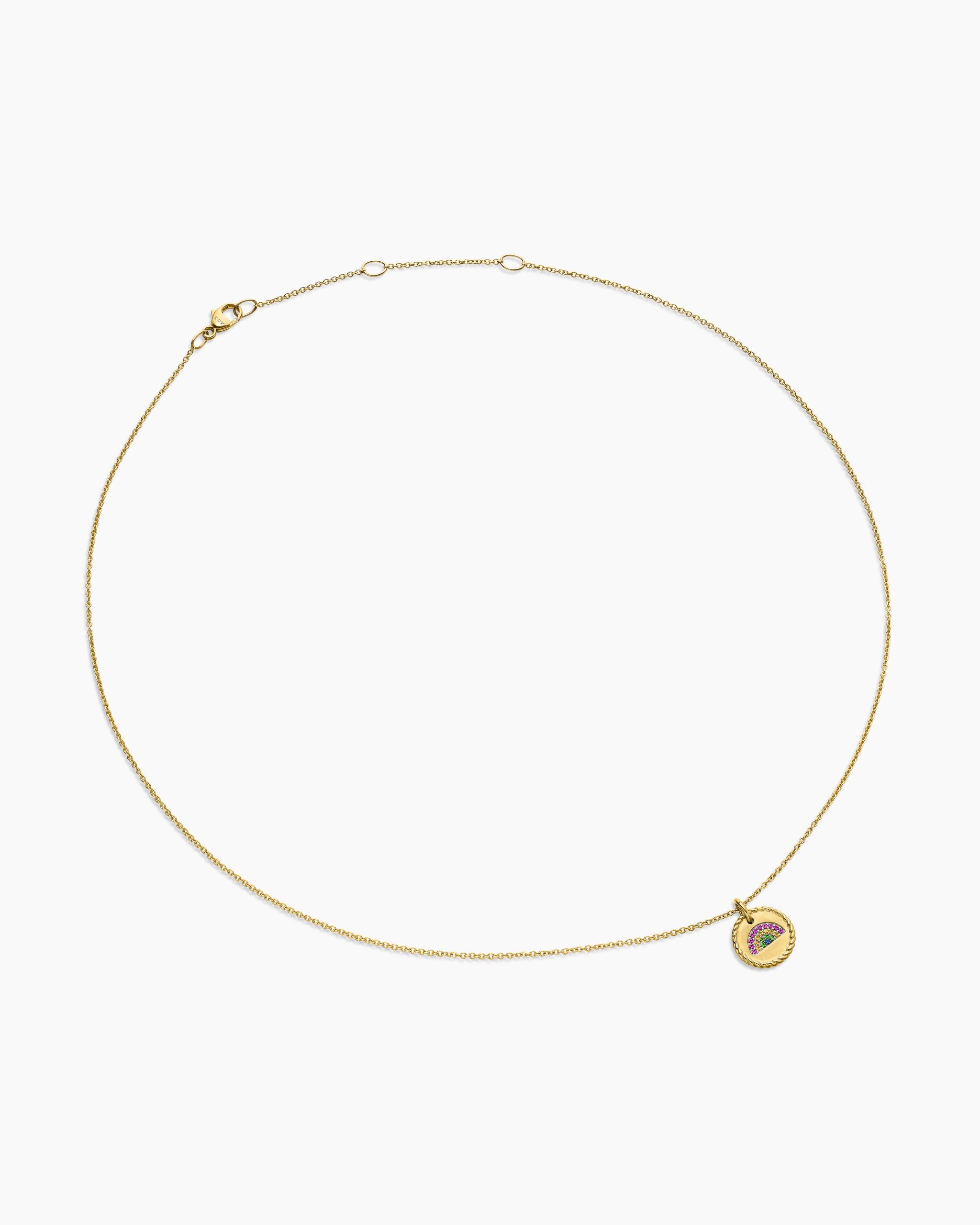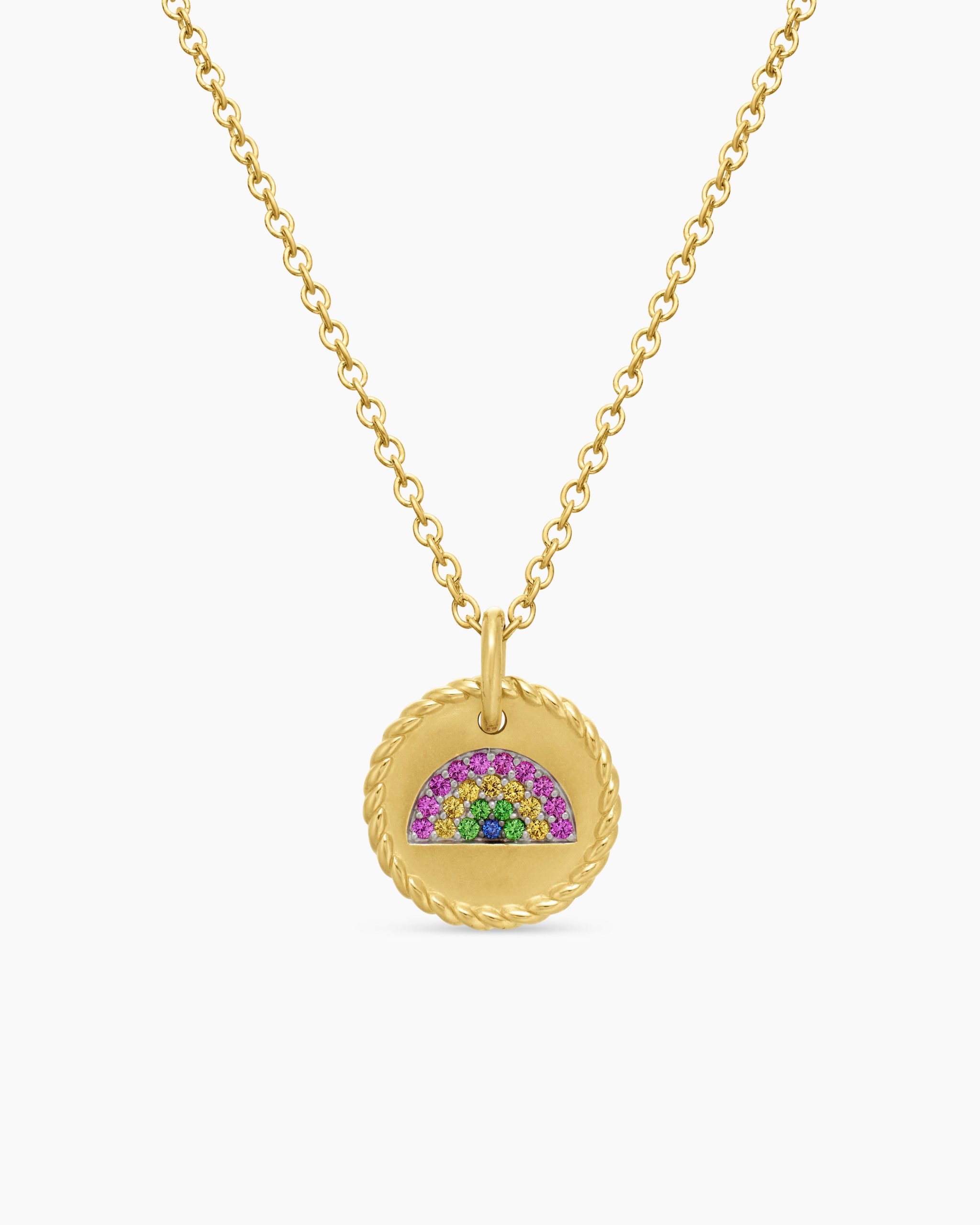 David Yurman’s iconic Cable motif beautifully adorns a universal symbol or shape, creating a modern talisman meant to be collected, combined and treasured. 18-karat yellow goldPink sapphires, yellow sapphires and tsavorites, 0.04 total carat weightAdjustable length, 16-18inCharm, 11mmChain, 1.1mmLobster clasp