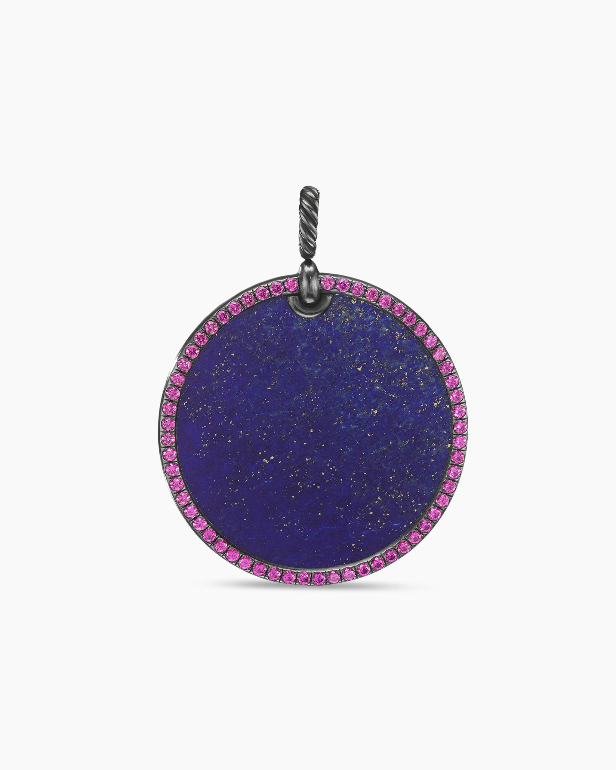 In this collection, David Yurman explores the circle—a timeless symbol of unity, a shape without beginning or end. Blackened sterling silverLapis lazuliPavé pink sapphires, 2.66 total carat weightPendant, 42mmFunctioning bail allows pendant to attach to a necklace or bracelet.Please note: pendant only; chain sold separatelyShown with: Box Chain