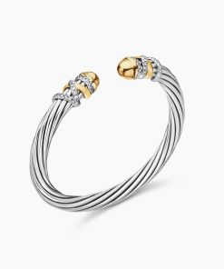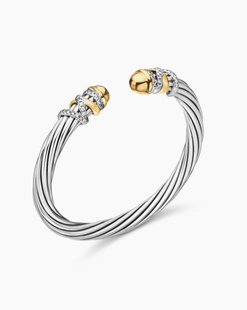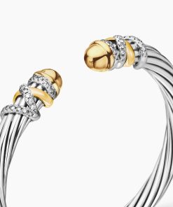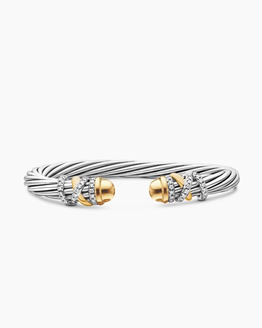 In the Helena Collection, David Yurman returns to the longer, leaner twist of his first handmade Cable bracelet, wrapping the iconic form with 18K yellow gold threads accented with hand-set pavé diamonds. Sterling silver with 18-karat yellow gold18K gold domesPavé diamonds, 0.48 total carat weightBracelet, 6mm