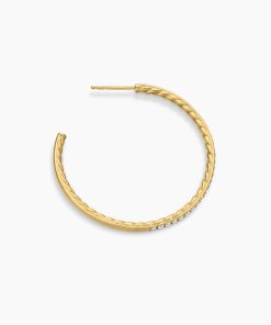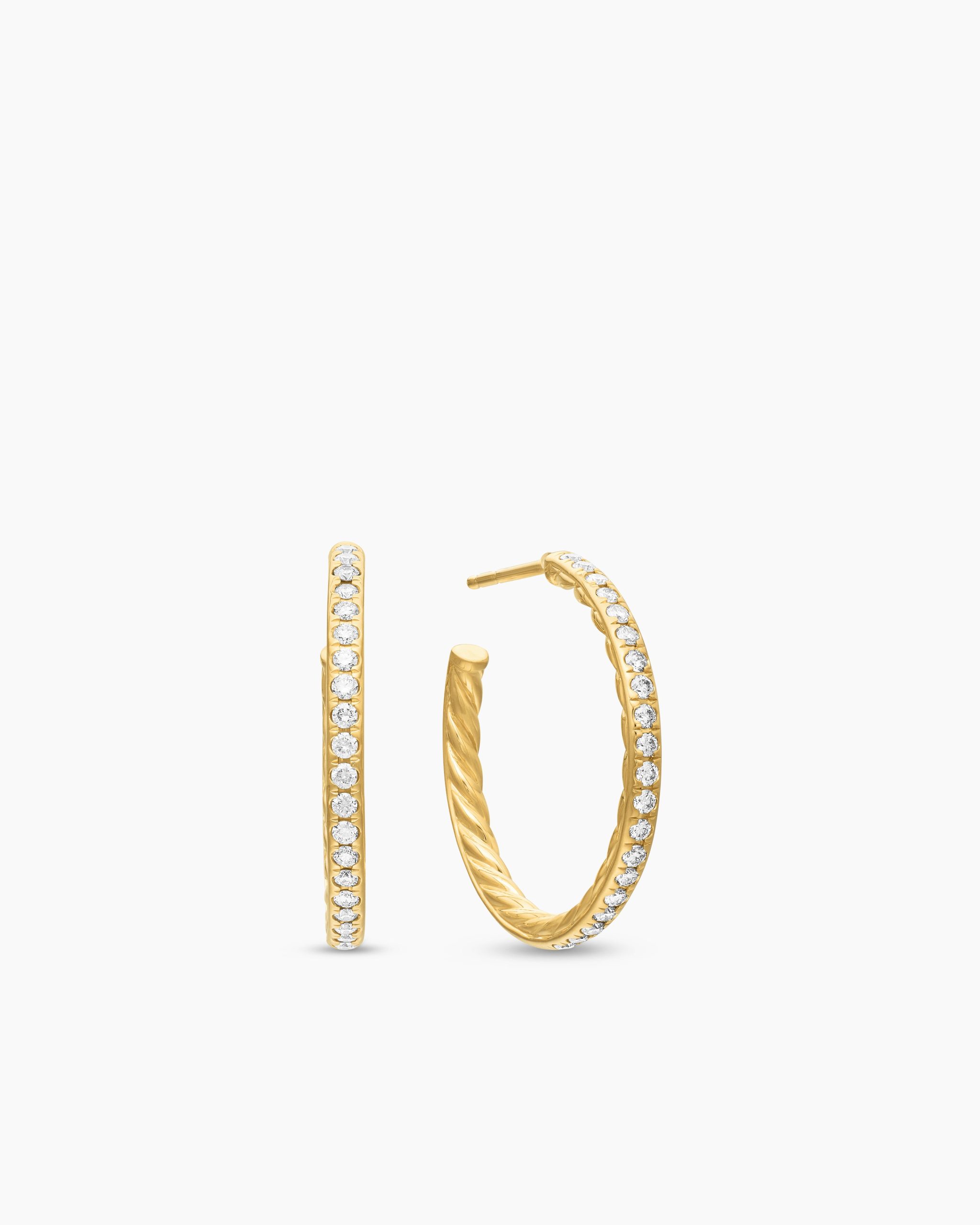 In Sculpted Cable, David Yurman transforms his signature design motif into a carved form. The effect is an entrancing wavelike pattern that retains the dimensional look of Cable’s original helix. 18-karat yellow goldPavé diamonds, 0.52 total carat weightHoop, 25.4 x 2.4mm
