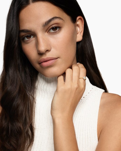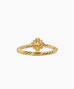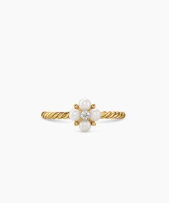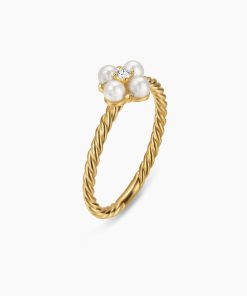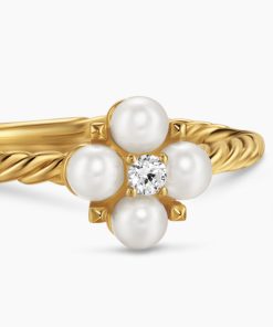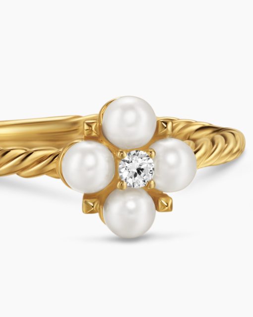 Referencing the art and architecture of the Renaissance period in Europe, this elegant piece combines the quatrefoil motif—long a part of David’s design vocabulary—with the iridescent glow of pearls.Akoya white pearls, 2.7-3.2mmDiamond, 0.03 total carat weightRing, 7.9mmBand, 1.7mmThis item can be resized. Please contact customer care for more information.