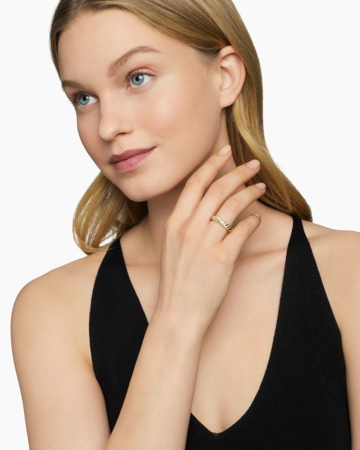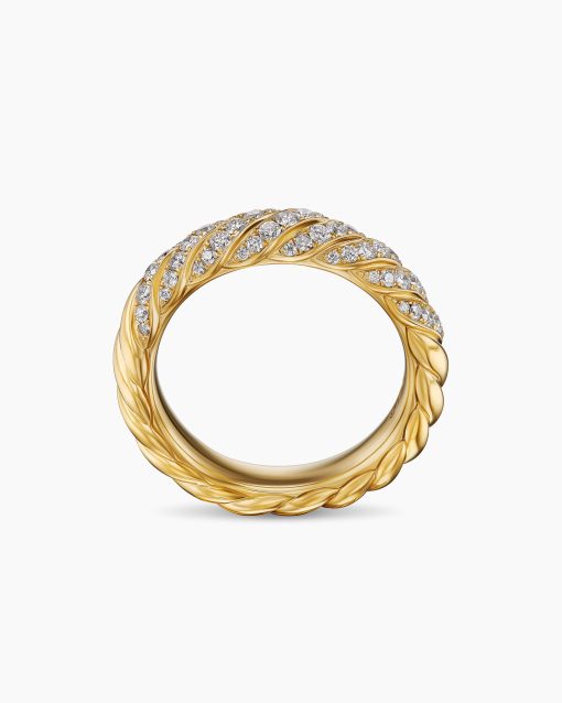 Inspired by his love of architecture and bas-relief sculpture, Evan Yurman designed this modern form by deconstructing Cable—the house’s signature motif—to its essence. Each design is a wearable work of art; precious metals are meticulously carved with exquisite wavelike patterns that dramatically catch the light. Elegant curves highlight the sensuality of the body, with pavé-set diamonds for a statement of added brilliance.18-karat yellow goldPavé-set diamonds, 0.39 total carat weightRing, 4.6mm