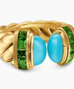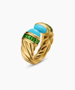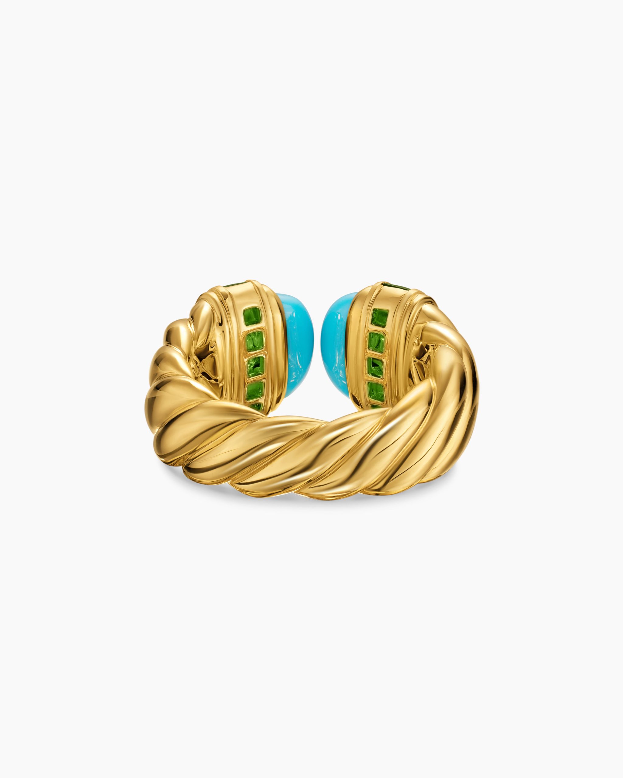 Inspired by his love of architecture and bas-relief sculpture, Evan Yurman designed this modern form by deconstructing Cable—the house’s signature motif—to its essence. Each timeless design is a wearable work of art. Precious metals are meticulously carved with mesmerizing wavelike patterns that dramatically catch the light. Elegant curves highlight the sensuality of the body.18-karat yellow goldTurquoise and tsavoritesRing, 12.4mm