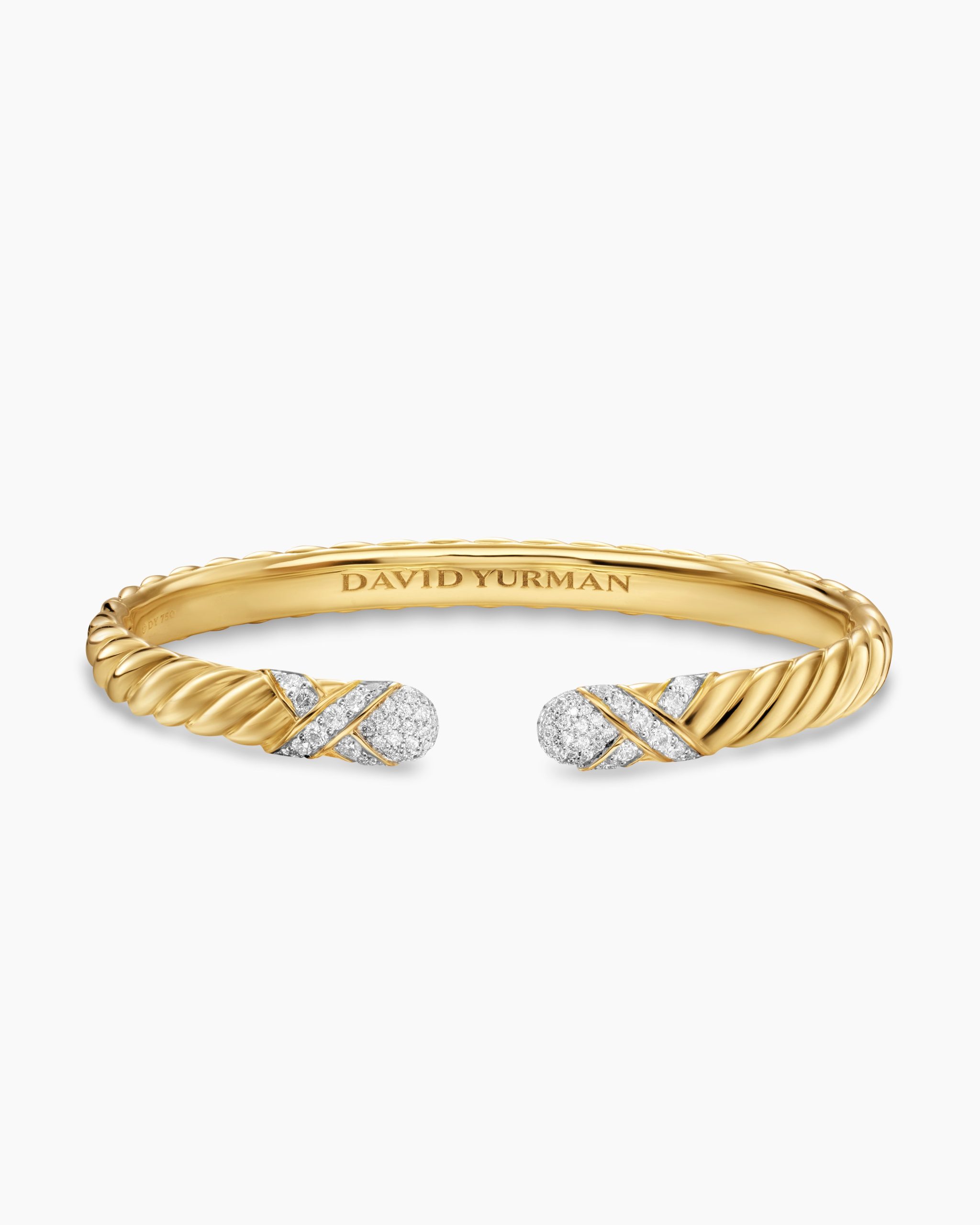 Inspired by his love of architecture and bas-relief sculpture, Evan Yurman designed this modern form by deconstructing Cable—the house’s signature motif—to its essence. Each design is a wearable work of art; precious metals are meticulously carved with exquisite wavelike patterns that dramatically catch the light. Elegant curves highlight the sensuality of the body, with pavé-set diamonds for a statement of added brilliance.18-karat yellow goldPavé-set diamonds, 0.70 total carat weightBracelet, 6.2mmHinge clasp