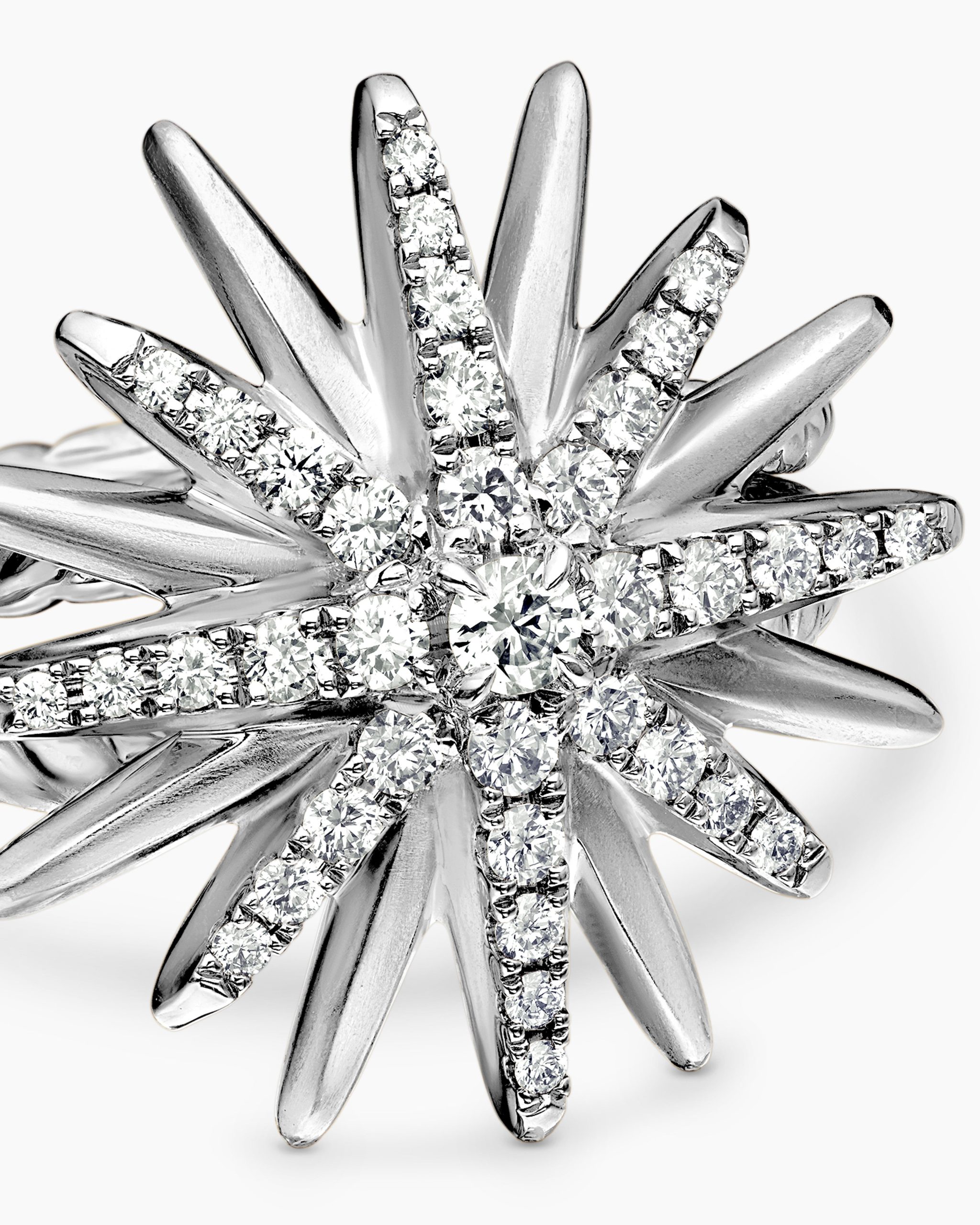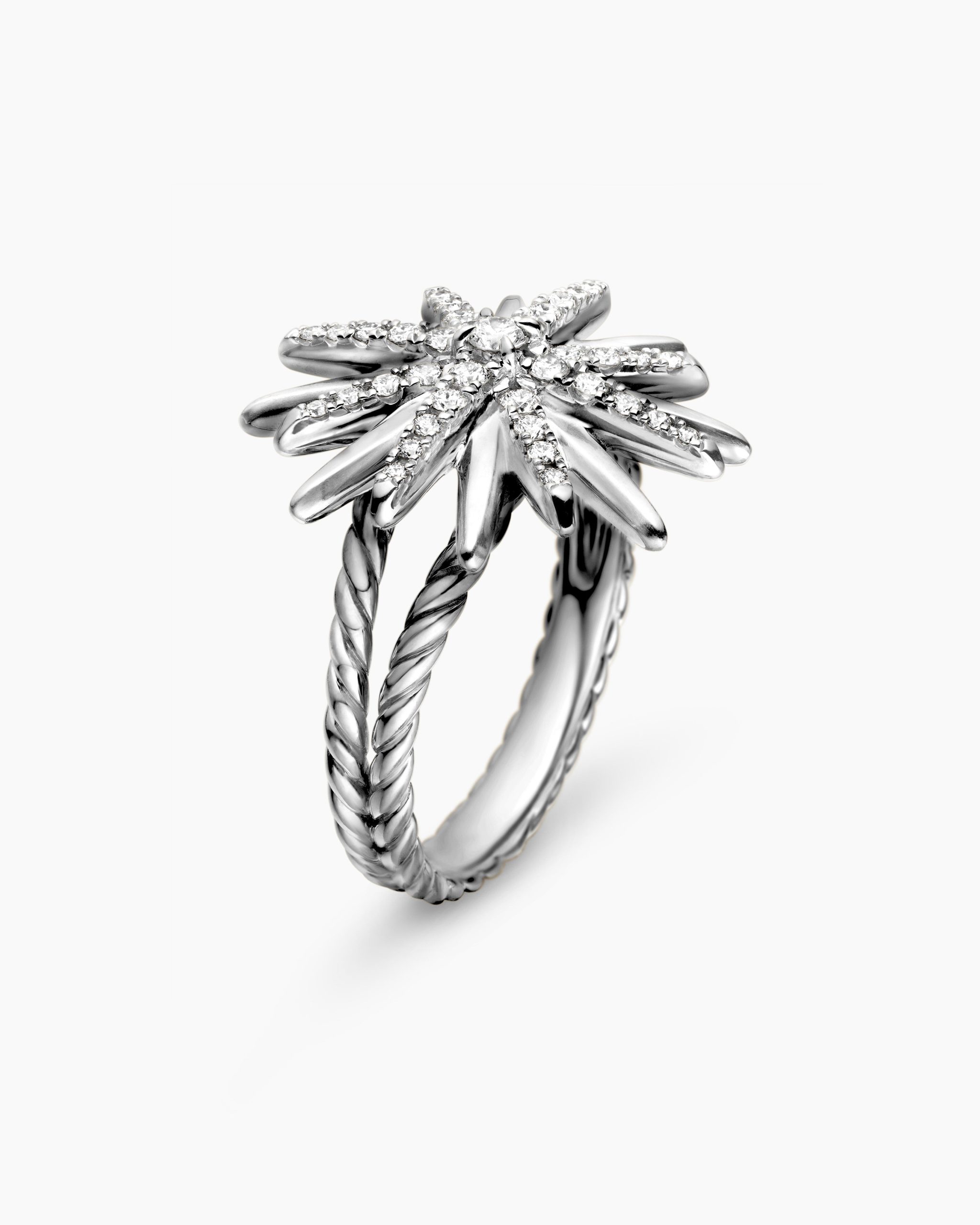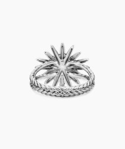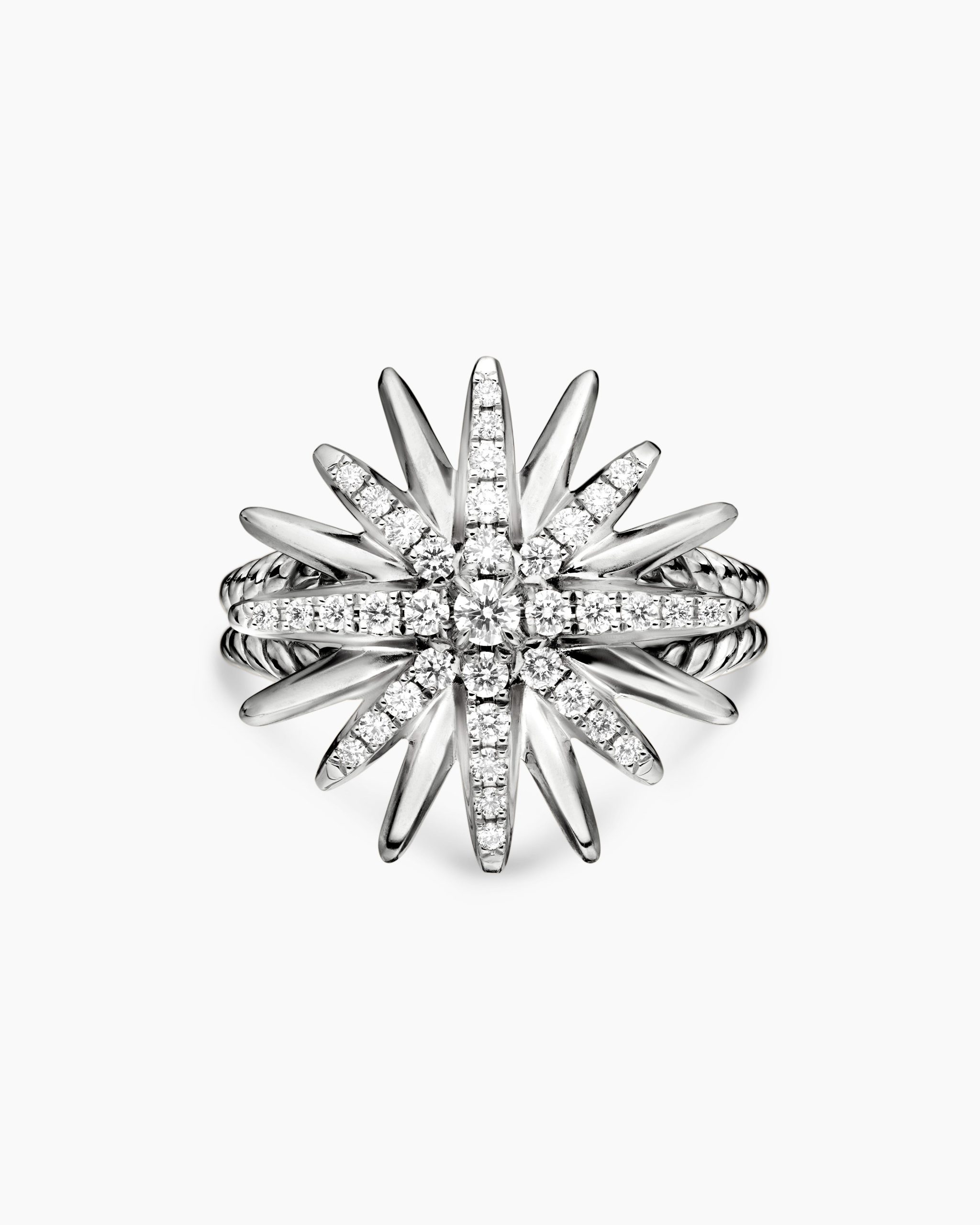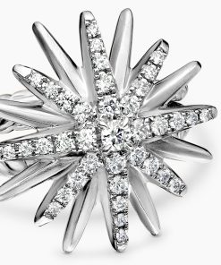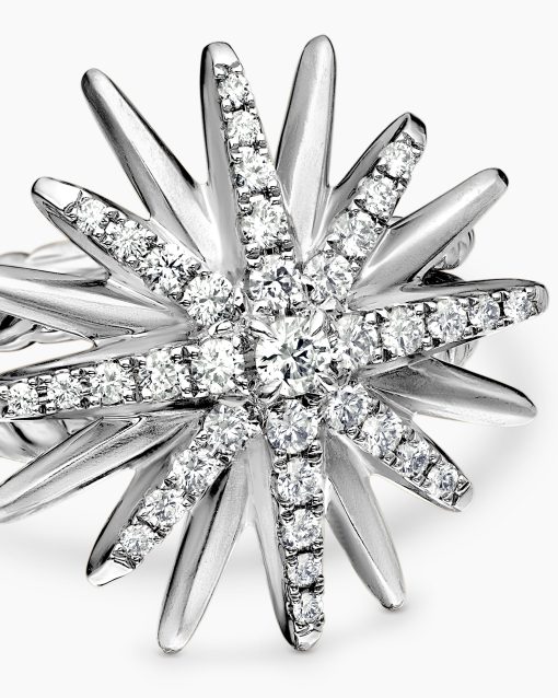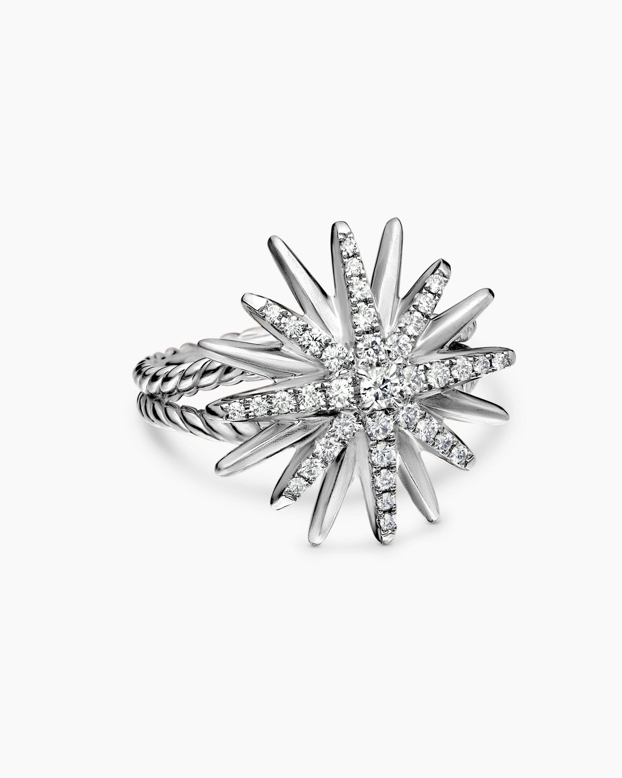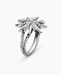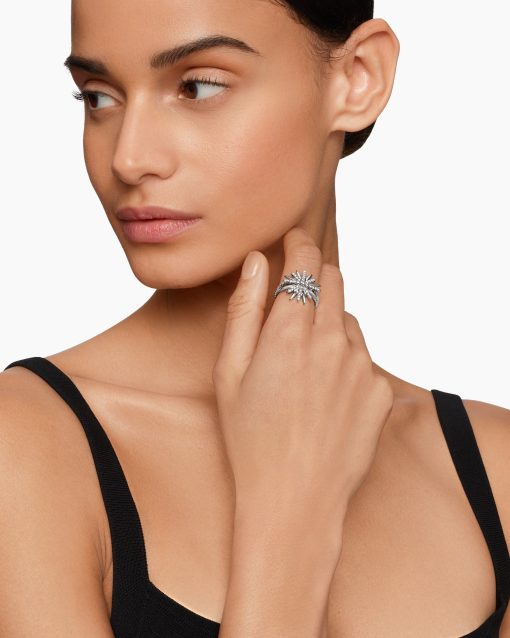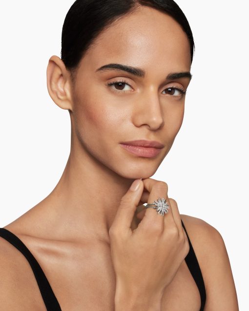 Starburst was born from David and Sybil Yurman’s experience watching fireworks illuminate the Paris night sky. The magical bursts of light greatly moved Sybil, inspiring David to create designs of brilliant star motifs. Sterling silverPavé diamonds, 0.41 total carat weightRing, 19mmThis item can be engraved. Please contact customer care for more information.