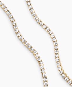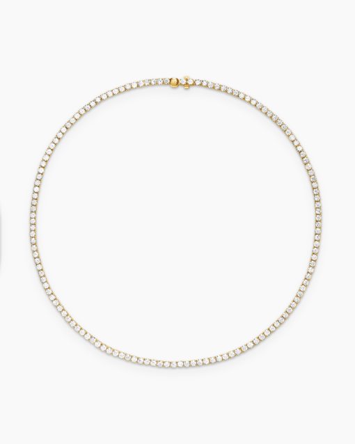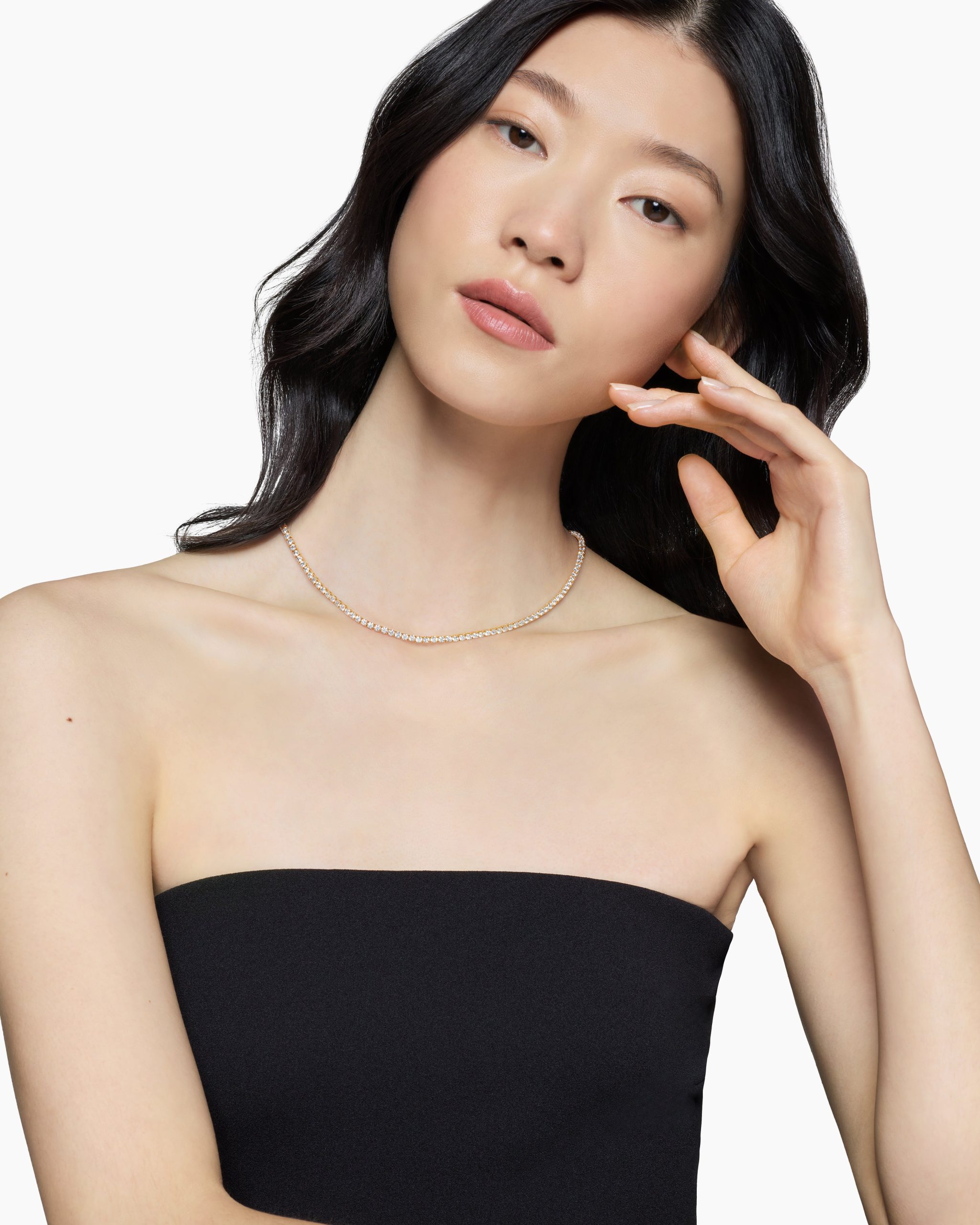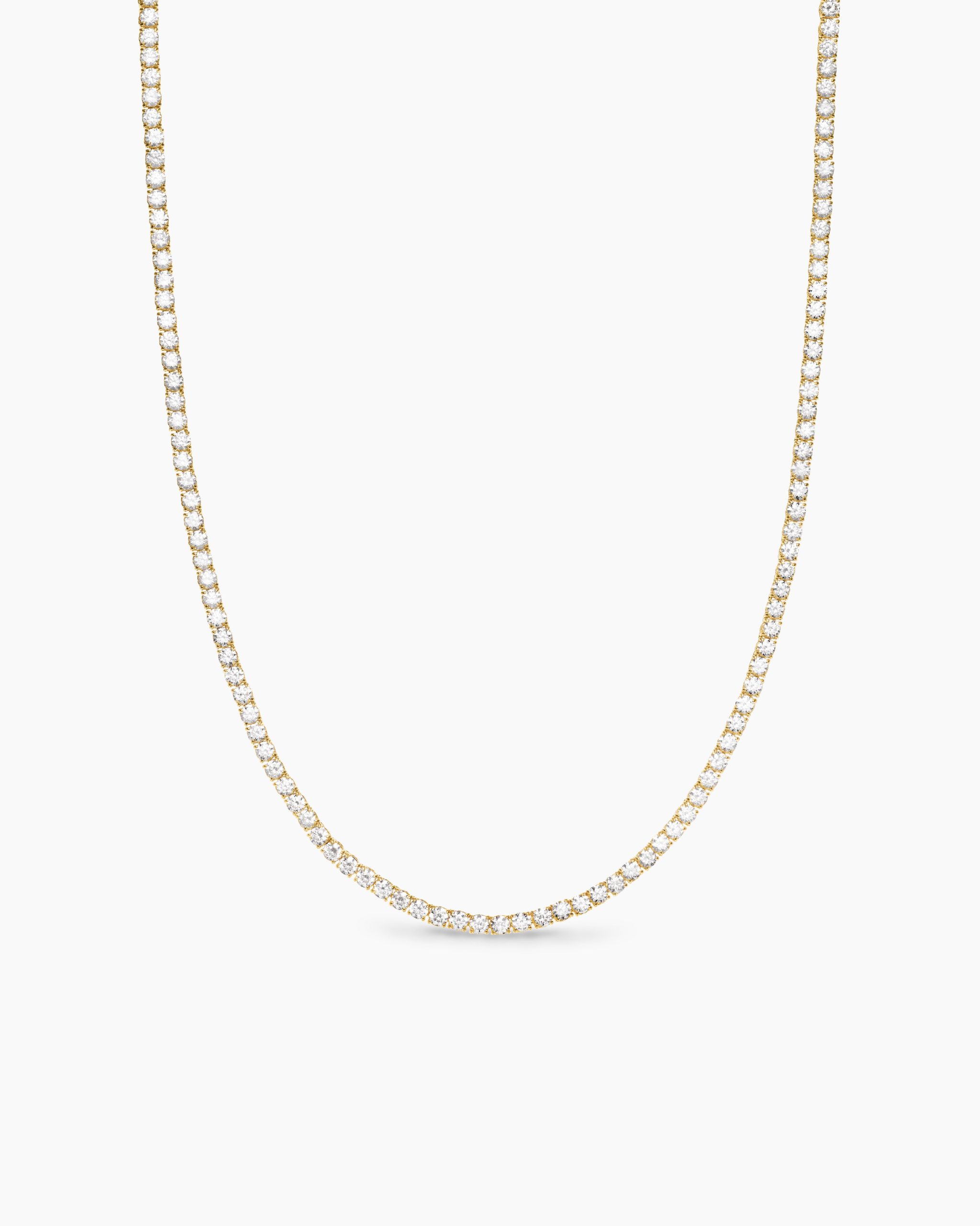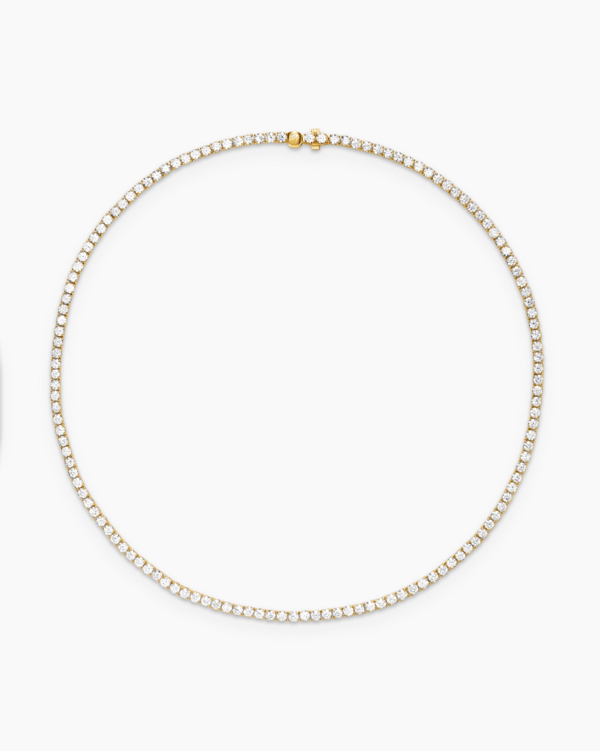 Ever since Chris Evert’s diamond bracelet flew off her wrist at the 1978 US Open, this style has been known as a “tennis bracelet”—a continuous line of bezel or prong-set diamonds. Now expanded to include necklaces, our elegant new additions come in both 18K yellow and white gold with hand-set stones. 18-karat yellow goldProng-set diamonds, 13.64 total carat weightNecklace, 3mmPush clasp